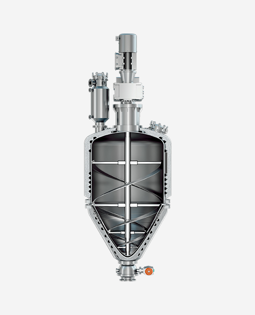 对筒体夹套、锥体夹套、搅拌器通入热媒实现对罐内滤饼的持续加热,此时搅拌器低速顺时针转动,使物料在罐内进行多维运动。 通过全方位的不规则往复运动,完成物料的高效率换热,同时,可向罐内通入热的气源,提升干燥效率。