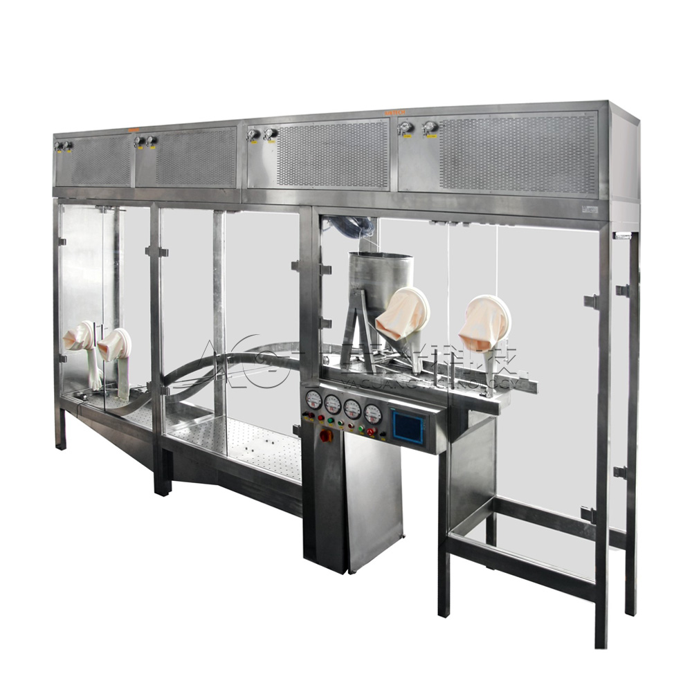 自动密闭出料装置 俗称"象鼻子出料装置",能够有效避免胶塞出料时与外界接触造成污染; 出料系统可进行CIP和